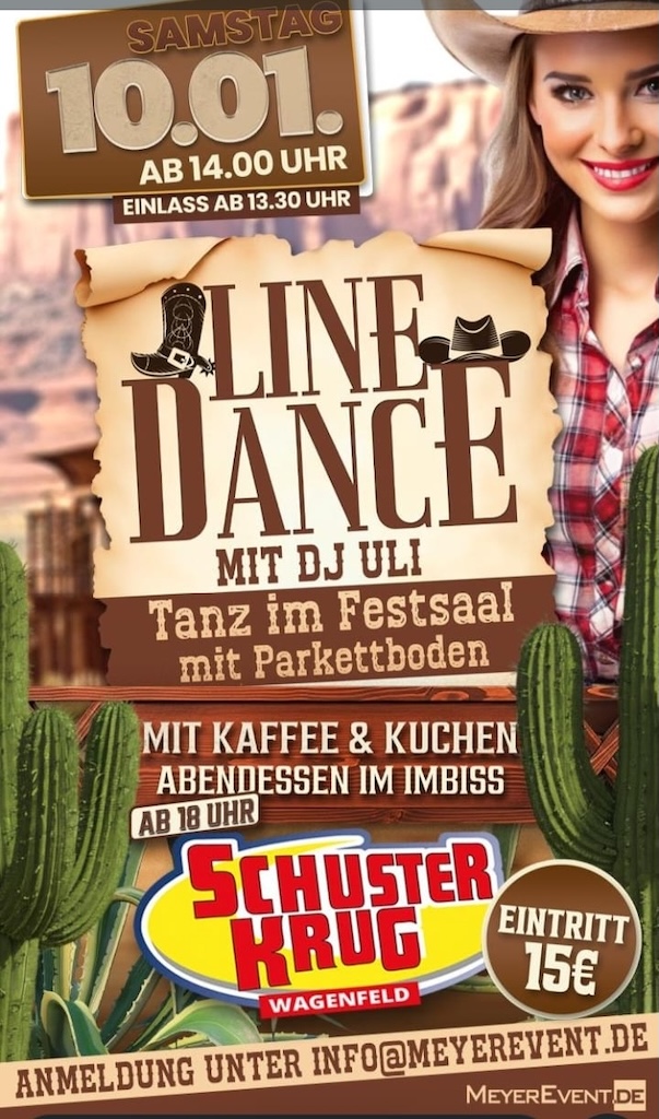 10.01.2026 – Samstag Schusterkrug – Wagenfeld Beitrags-Autor:WebOnkel Beitrag veröffentlicht:11. Januar 2026 Beitrags-Kategorie:Gallery Beitrags-Kommentare:0 Kommentare Wir von der Country- & Western-Tanzgruppe Drebber waren mit 12 Leuten richtig gut vertreten 🤠💃🕺Die Musikauswahl war super gemischt und DJ Uli hat uns mal wieder klasse unterhalten. Es hat richtig Spaß gemacht! Das könnte dir auch gefallen 10-jährigen Jubiläum 8. April 2026 Mainly Country 21. April 2026 Line-Dance-Kaffeenachmittag ins Landgasthaus Krimpenfort 30. März 2026 Schreibe einen Kommentar Antwort abbrechenDu musst angemeldet sein, um einen Kommentar abgeben zu können.